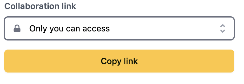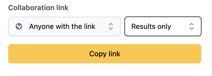 Much of the same reasoning applies to the shareable link feature (see image below). We have three elements: the main dropdown, the results only/edit access dropdown, and the copy link button. We can reduce this and improve the UX by having a switch component that disables the access level menu when toggled off, a url input field, and a copy button.