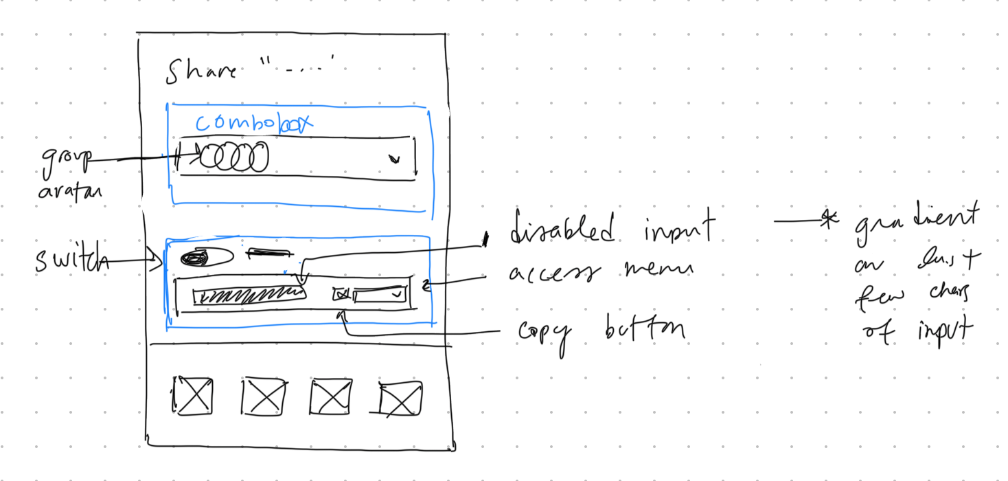 Implementation often reveals improvements the sketch missed. My original sketch placed the switch on the left side of the shareable URL row, but during the build I moved it to the right. It follows the natural reading direction and keeps the label prominent. I also moved the access level menu to its own row for clearer separation between the toggle and the permission setting.